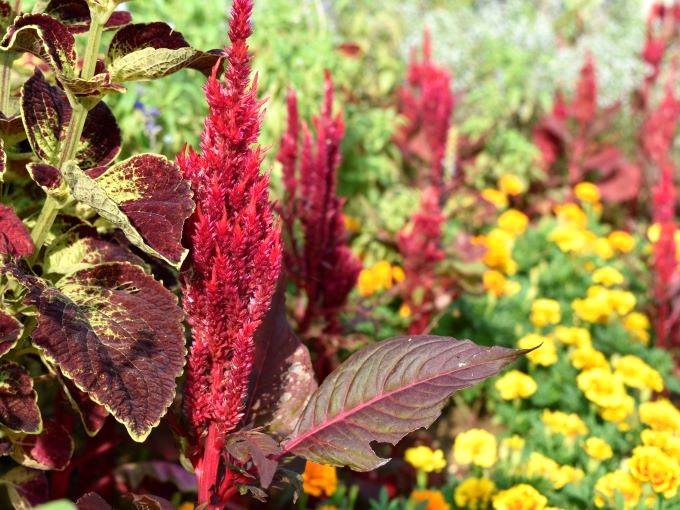 遊園地行きエレベーターを降りてすぐの花壇に咲くケイトウとマリーゴールド