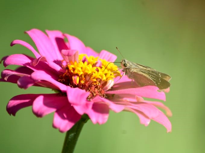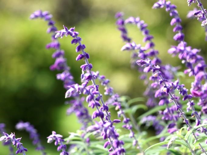 東屋へ向かうどうだん通りに咲くアメジストセージとジニア(百日草)