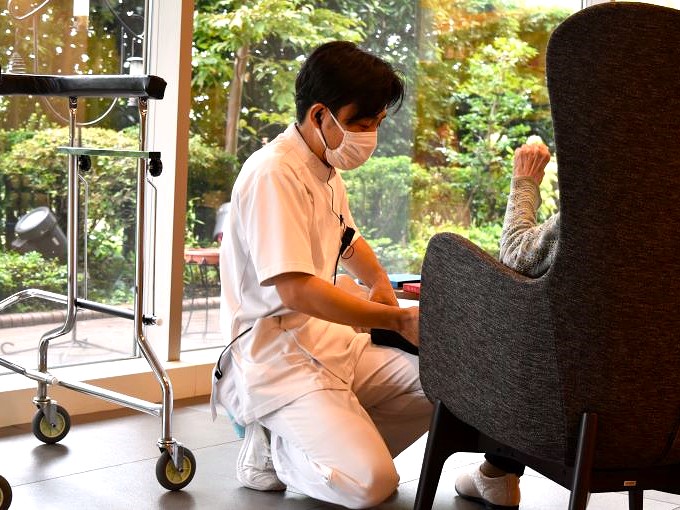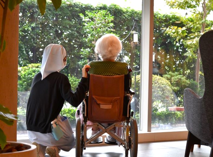 冷たい空気に包まれた今日は時折雨も混じる天気となりました。1階ロビーラウンジでは、鳥寄せに集まる鳥を見ながら職員と会話をされるお姿が見られました。