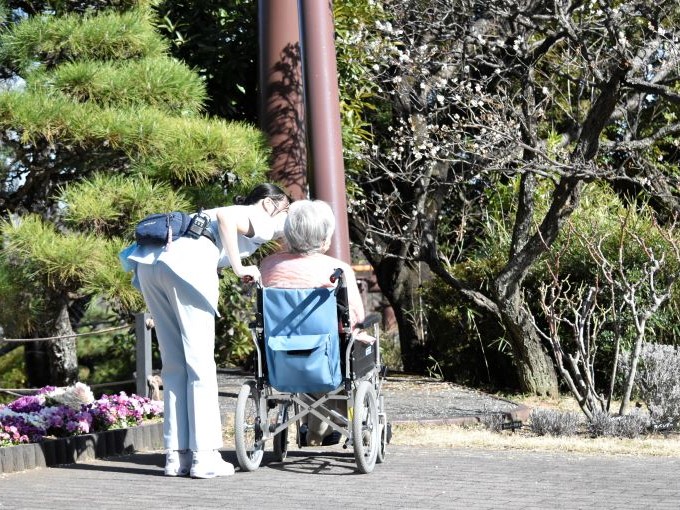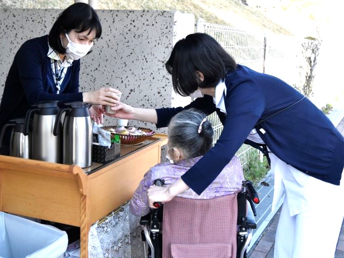風は少しあるものの暖かな陽射しが降り注ぐ中、緑茶・梅昆布茶と和菓子のワゴンサービスが行われました。風に舞う梅の花びらを目で追いつつお散歩されるお姿も見られました。
