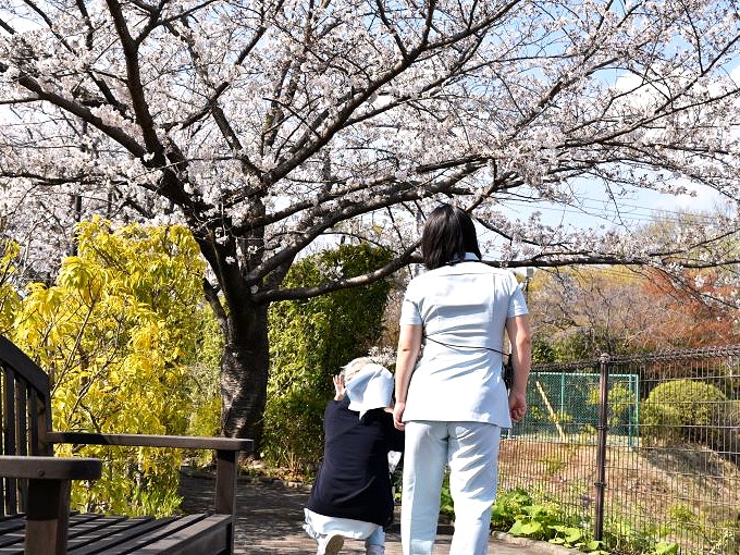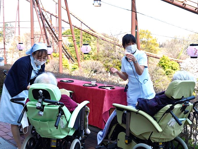 遊園地側テラスではレクリエーション科によるお花見が開催されていました。おでん、桜餅、甘酒、玄米茶、桜餅風デザートをご用意、桜を眺めながら召し上がっていただきました。桜の木の下では、笑顔の患者様のお姿を職員が写真におさめていました。